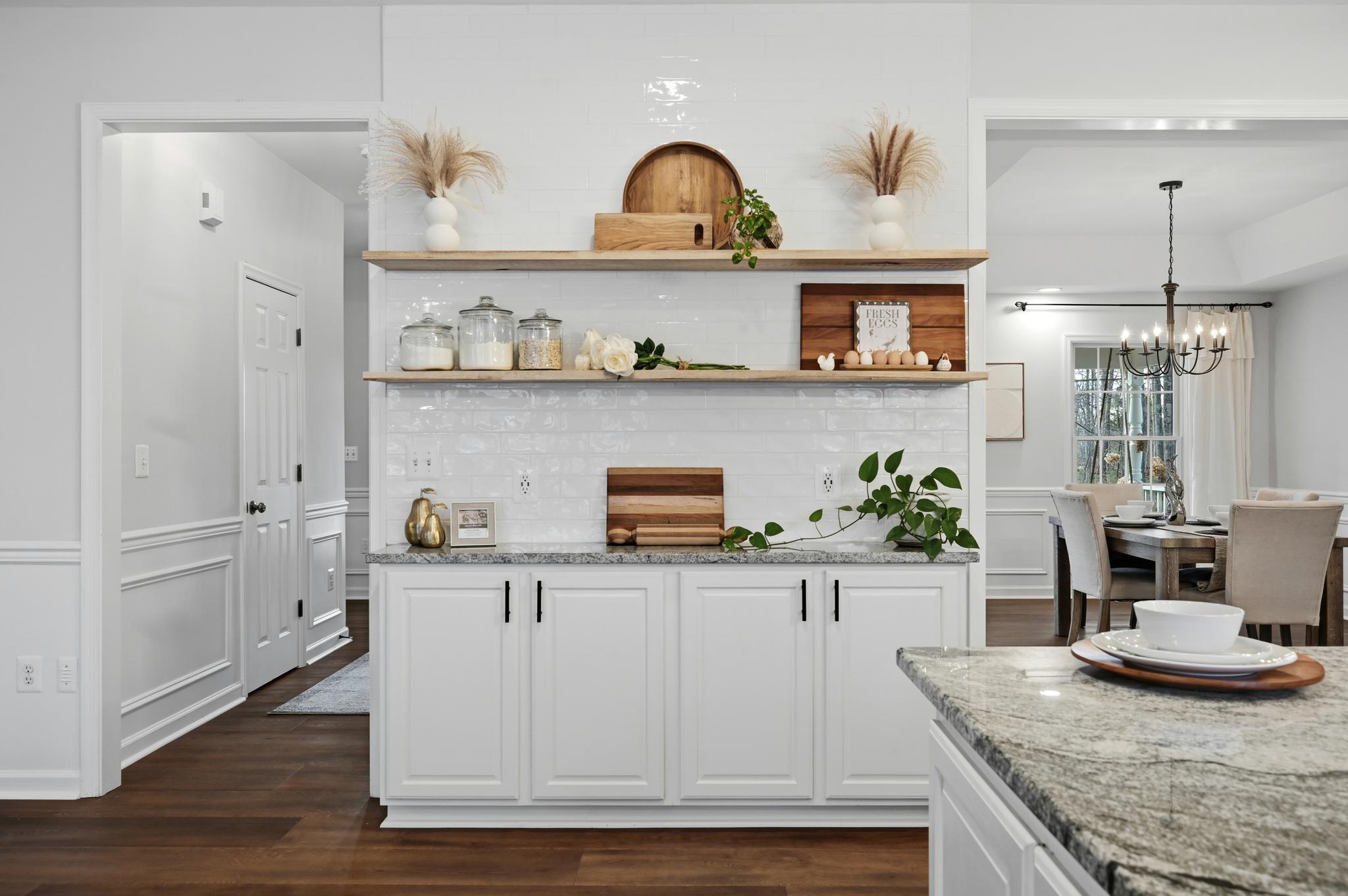 - Open shelving and backsplash